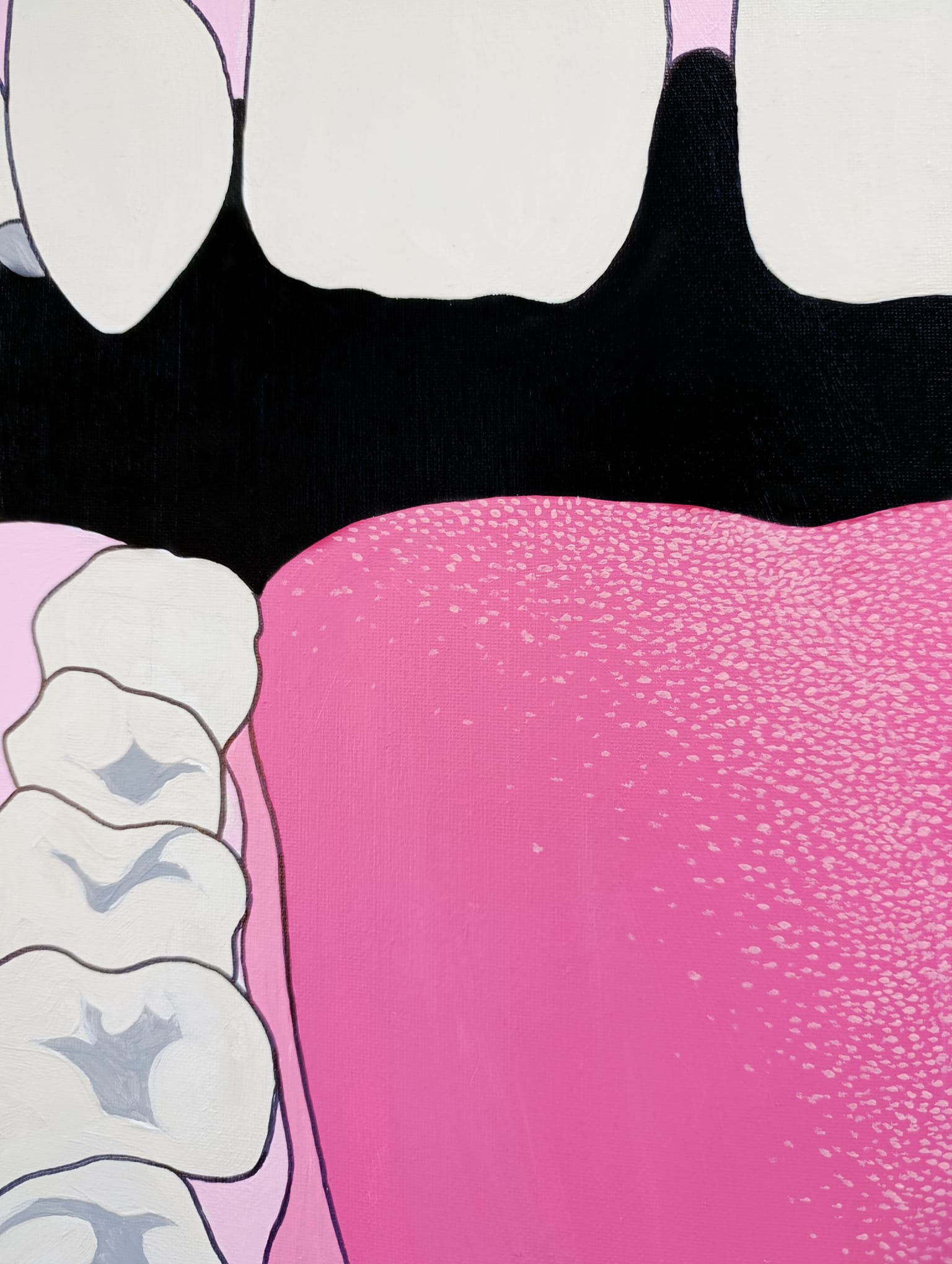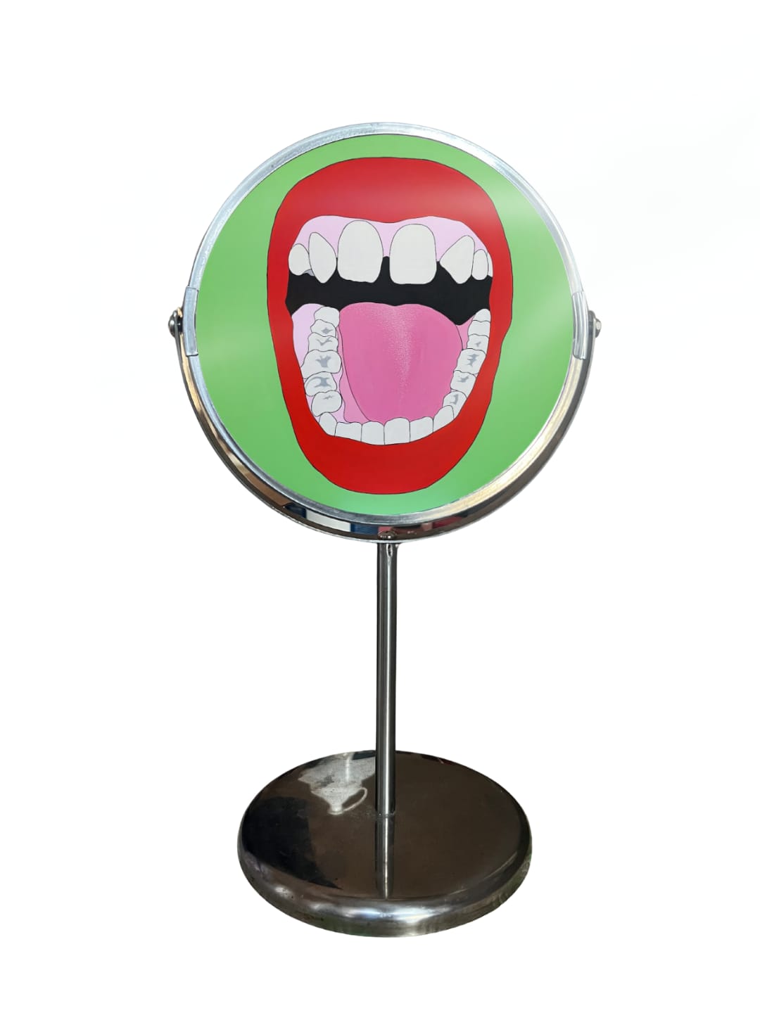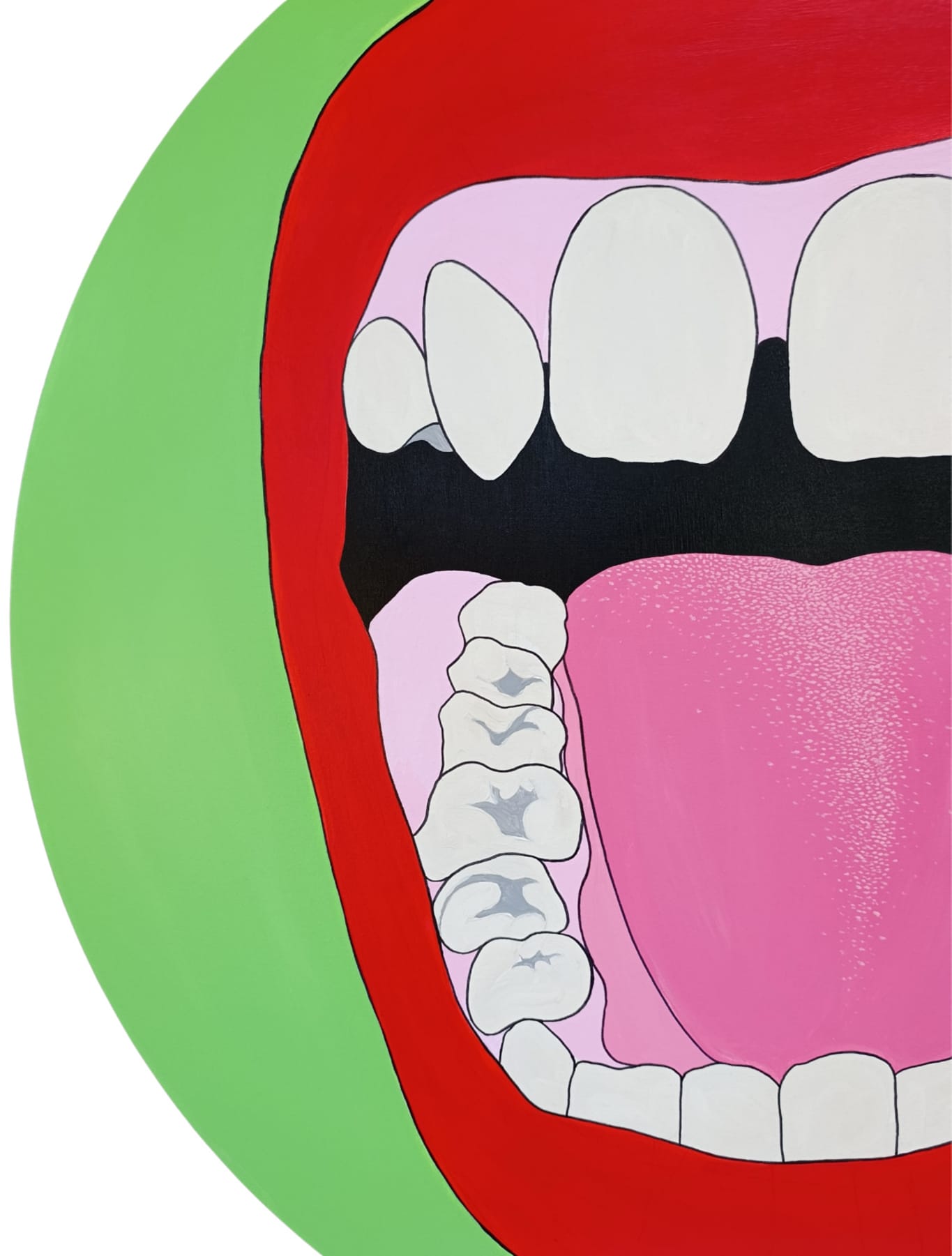 My most recent work, Laughing at Myself, is a self-portrait focusing on my mouth, painted on a circular canvas with a diameter of 90 cm. For many years, this part of my body represented something to conceal — missing or crooked teeth, restrained smiles before the mirror. This piece was conceived as an act of acceptance and catharsis: a mouth that stares back at me, confronts me, and laughs unashamedly in my face. The circular format of the canvas ironically echoes the mirror frame that long served as a silent judge, while the saturated palette demands observation. Through irony and color, I seek to establish a dialogue with my own fragilities and experiences, to transform them into a space of expression and catharsis.” Matilde Milan, Studio Fibra